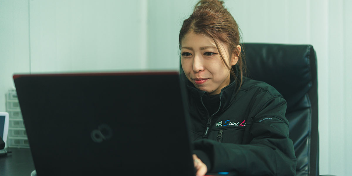 私はスタートラインの立ち上げから関わってきました。いま会社はこれから4期目に入ります。 普段は、営業を中心に動きつつ、事務面のサポートもしています。肩書きは「事務長」になっていますが、実態としては“現場が回るように整える役”に近いかもしれません。 スタートラインは現場も営業もスピードが命です。 だから私は、お客様対応・段取り・社内の連携が止まらないように、先回りして動くことを意識しています。